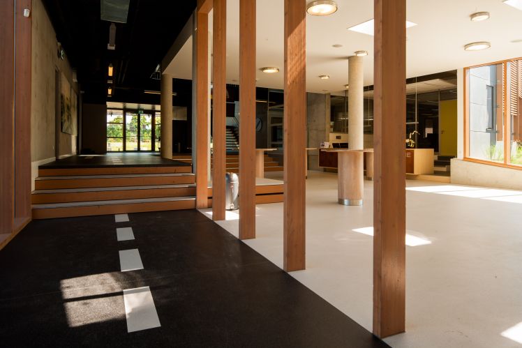 Om de verdiepingen tussen de noord- en zuidvleugel met elkaar te verbinden, werd een vliesgevelsysteem toegepast. Dit systeem bestaat uit dragende houten (Lariks) portalen. Deze portalen werden voorzien van beglazing en aan de buitenzijde afgewerkt met aluminium lijsten. Binnenin het gebouw is een deel van de ruimten opnieuw ingedeeld. Op de verdiepingen, die na ingebruikname van het gebouw ook dienst doen als leslokalen, zijn 4 trappenhuizen geplaatst. Het gehele gebouw werd voorzien van nieuwe wand-, vloer- en plafondafwerkingen en overige afwerkingen.